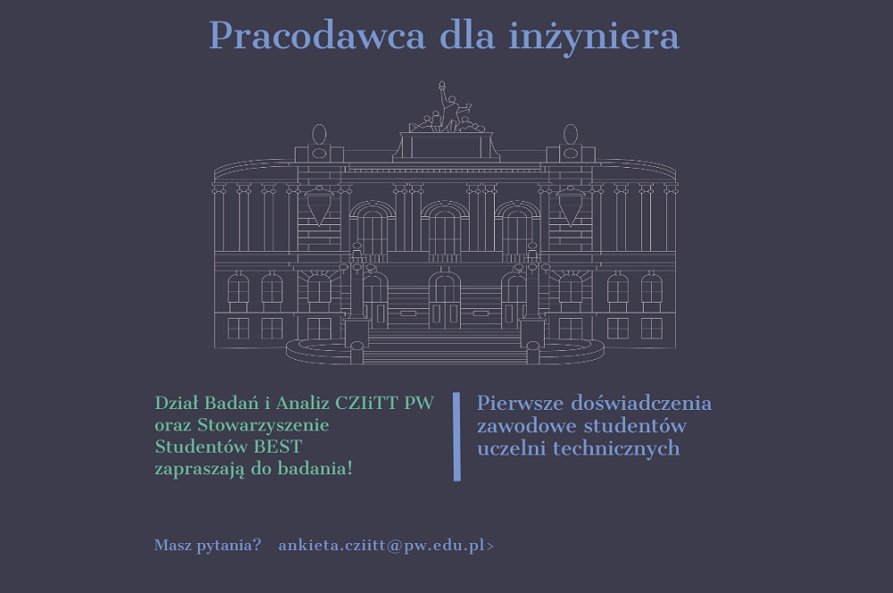 Dział Badań i Analiz Centrum Zarządzania Innowacjami i Transferem Technologii PW oraz Stowarzyszenie Studentów BEST zapraszają do wzięcia udziału w badaniu w ramach plebiscytu „Pracodawca dla inżyniera”.